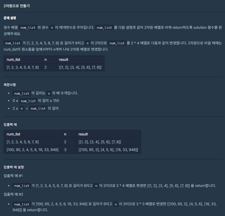 [프로그래머스] 코딩테스트 연습 -> 코딩테스트 입문 -> 2차원으로 만들기
