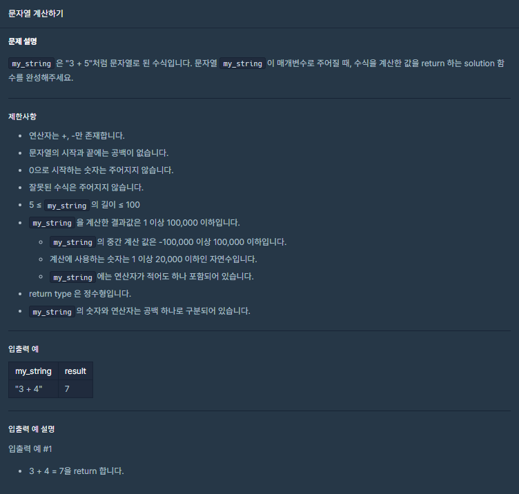 [프로그래머스] 코딩테스트 연습 -> 코딩테스트 입문 -> 문자열 계산하기