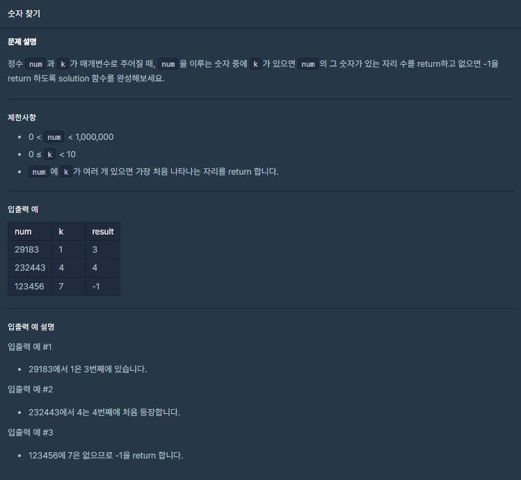 [프로그래머스] 코딩테스트 연습 -> 코딩테스트 입문 -> 숫자 찾기