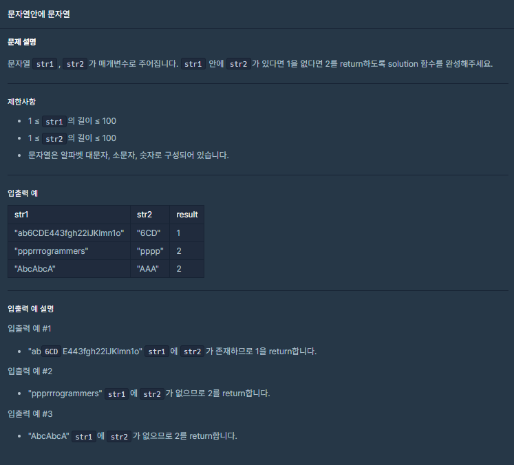 간단하게 조건문에 str1.contains(str2) 를 넣어주면 되며, true일 땐 1, 아닐 땐 2를 return 하도록 하면 된다.