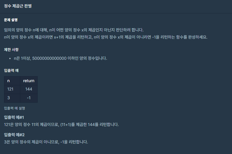 [프로그래머스] 코딩테스트 연습 -> 연습문제 -> 정수 제곱근 판별