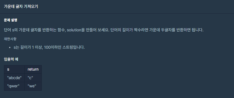 [프로그래머스] 코딩테스트 연습 -> 연습문제 -> 가운데 글자 가져오기