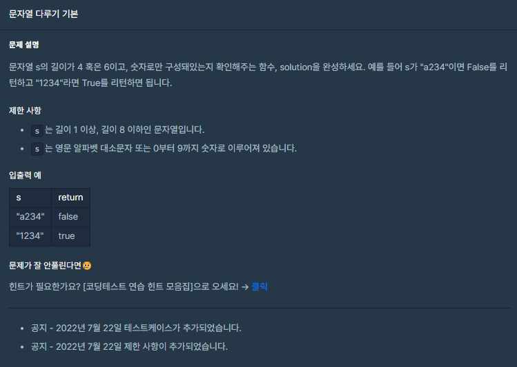[프로그래머스] 코딩테스트 연습 -> 연습문제 -> 문자열 다루기 기본