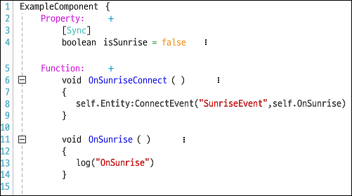 self.Entity:ConnectEvent(self.OnSunrise) Method 예시 (HandleSunriseEvent와 동일하게 작동)