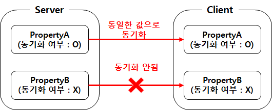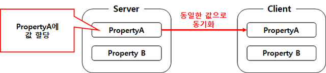 - 프로퍼티 A가 있을 때, 서버에서 특정 조건에 의해 프로퍼티 A에 어떤 값이 할당되면, 클라이언트에 있는 프로퍼티 A는 서버에서 할당된 동일한 값으로 맞춰지게 됨. 하지만 반대로 클라이언트의 프로퍼티 A에 값을 할당하면 서버의 프로퍼티 A에는 어떤 변화도 발생하지 않음.