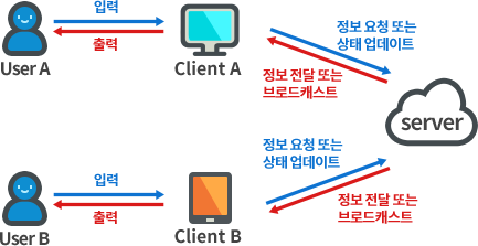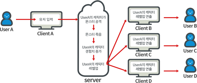 특정 클라이언트로부터 정보를 받은 서버는 클라이언트에게 다시 정보를 보내주거나, 혹은 전송한 내용을 게임 진행 상황에 업데이트시키고, 업데이트된 내용을 다시 모든 클라이언트에게 전송함으로써 게임을 이용하는 모든 유저가 동일한 상황이 될 수 있도록 맞춰줌