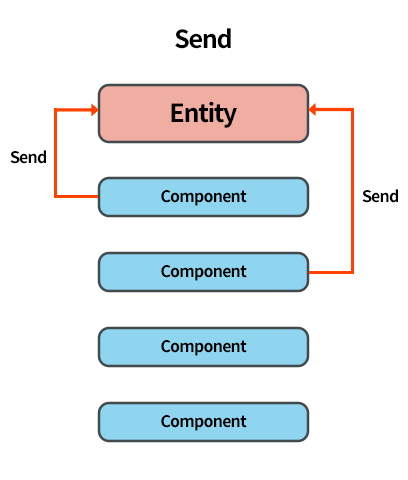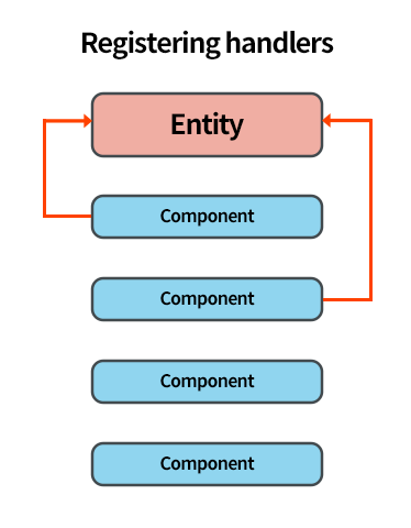 Component 들이 Entity에 핸들러를 등록하고 Sender 역시 Entity를 통해서 이벤트 발생. Entity 들은 핸들러들에게 해당 Event를 전송