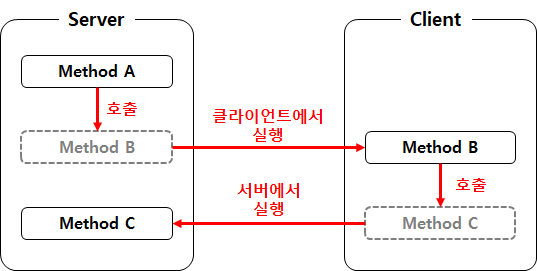 아래 상황을 예로 들면, 서버에 선언된 함수 B의 실행 공간을 클라이언트로 설정했다면, 함수 B는 서버 내 다른 함수에서 호출이 가능하지만, 클라이언트에서 실행되기 때문에 서버에서 호출할 수 있는 클라이언트 함수처럼 사용 가능.