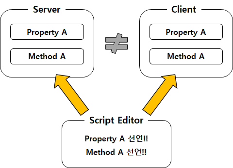 - 제작자가 스크립트에서 선언한 프로퍼티와 함수는 별도의 설정을 하지 않는 한 기본적으로 서버와 클라이언트 두 개의 공간에 각각 독립적으로 생성