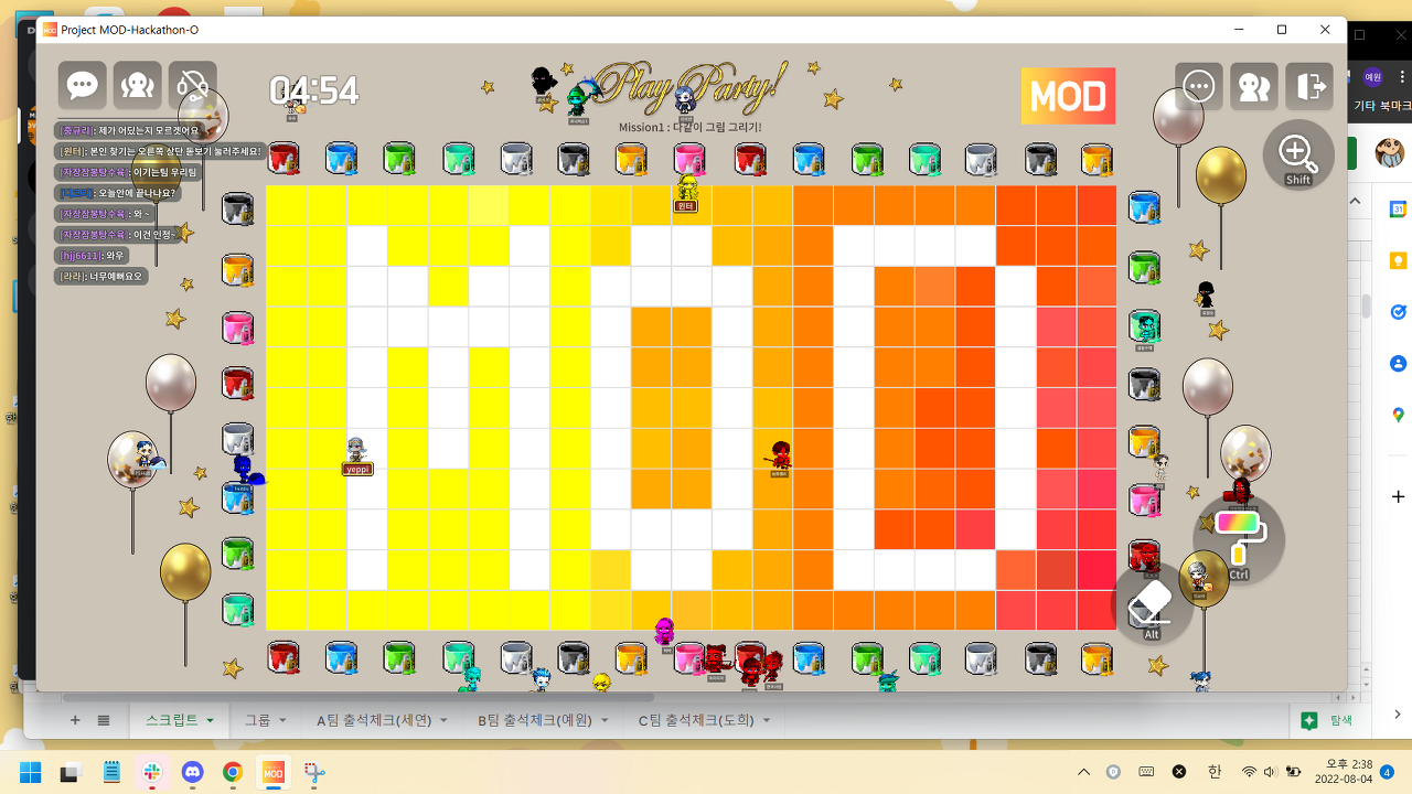 나는 B팀이었다 중간에 있는 B팀의 미션은 MOD의 모양대로 페인트를 칠해서 완성하는 게임이었는데,,,
