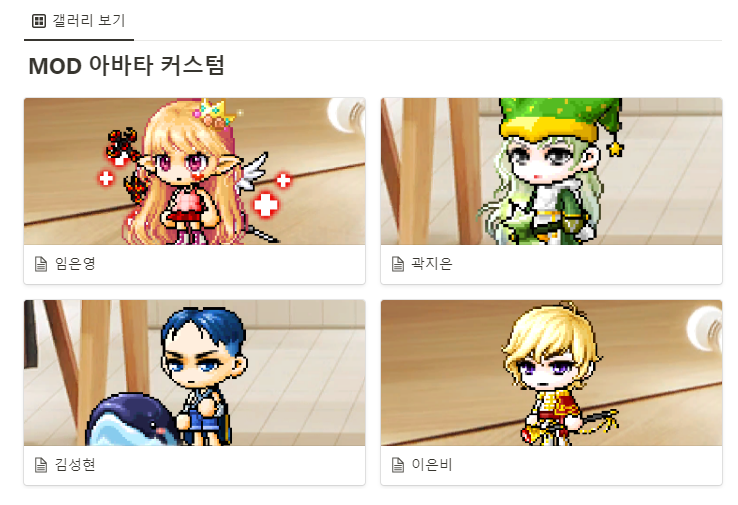 우리 팀 페이지에 들어가면 이렇게 주차별 활동기록이 먼저 뜨고, 아바타 커스텀을 전시할 수 있는 공간도 생성해놓았다.