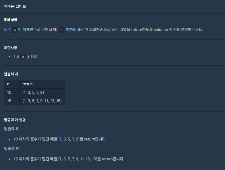 [프로그래머스] 코딩테스트 연습 -> 코딩테스트 입문 -> 짝수는 싫어요