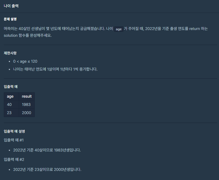 [프로그래머스] 코딩테스트 연습 -> 코딩테스트 입문 -> 나이 출력